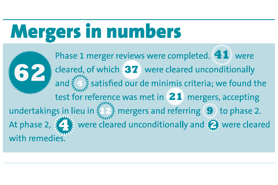 We carried out several high-profile merger investigations of great significance to the UK economy, including Fox/Sky, Tesco/Booker and Wood/Amec. You can read more about these later in this report.