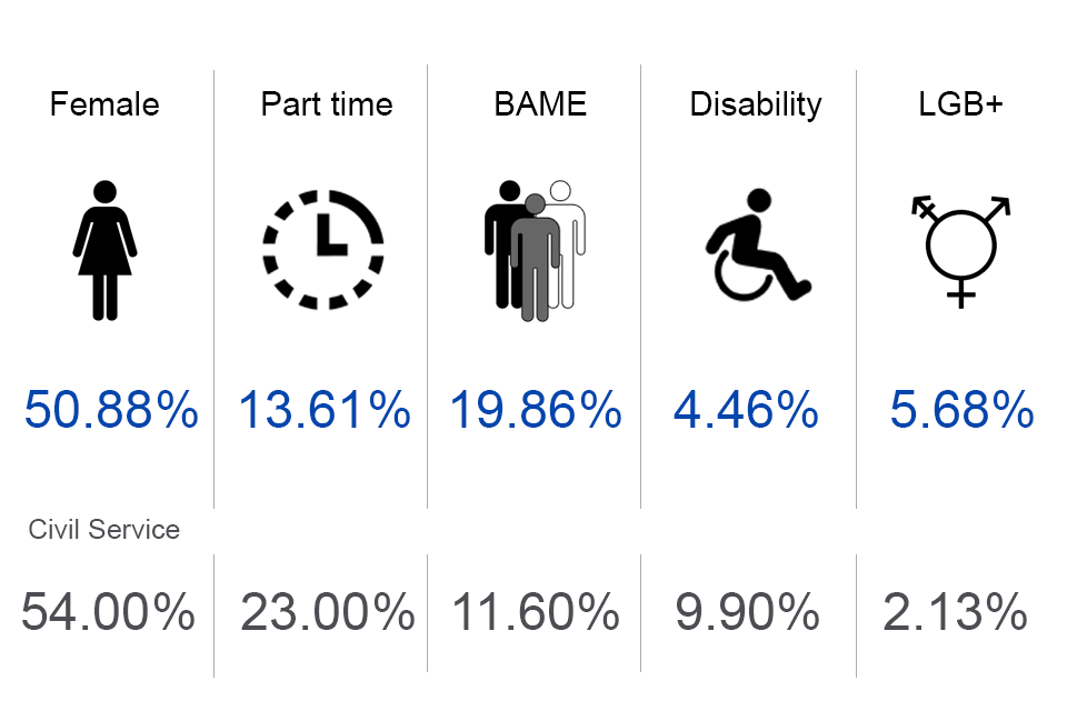 Overall, nearly twice as many staff identify themselves as BAME or LBG+ as they do in the Civil Service as a whole. We have become a Disability Confident Employer and refreshed out flexible working policies to better support part time workers and those with a disability.