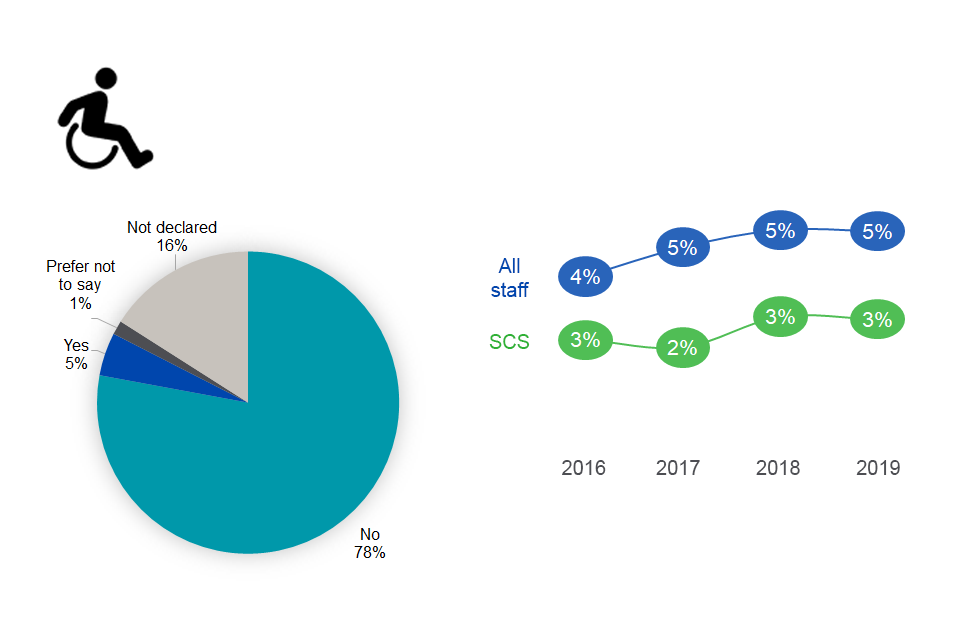 76% of CMA staff don't have a disability, 16% are not declared, 5% identify as having a disability and 1% prefer not to say. In 2016 4% of CMA staff identified as having a disability, in 2017, 2018 and 2019 5% identified as having a disability.