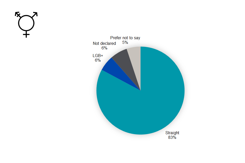 Our declaration rates for sexuality are amongst the highest in our sector and the Civil Service. 83% of all staff are straight and 6% are LGB+.