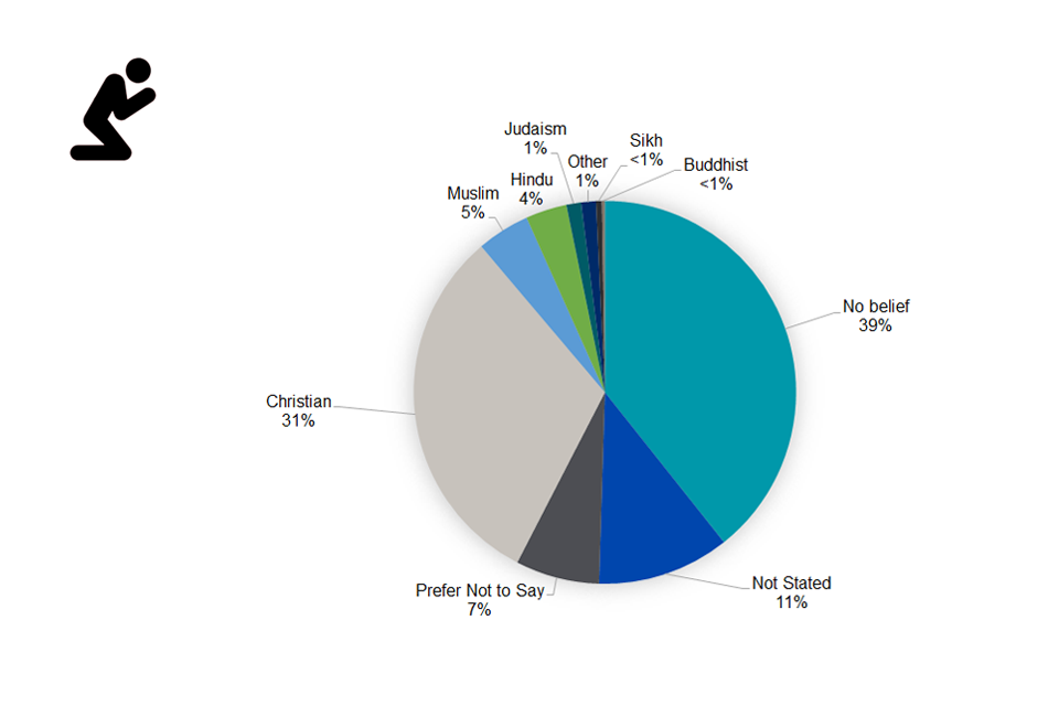 Pie chart showing 39% of CMA staff identify as having no belief, 31% Christian, 11% no belief, 7% prefer not to say, 5% Muslim, 4% Hindu, 1% Jewish, 1% Sikh, 1% Buddhist and 1% other.