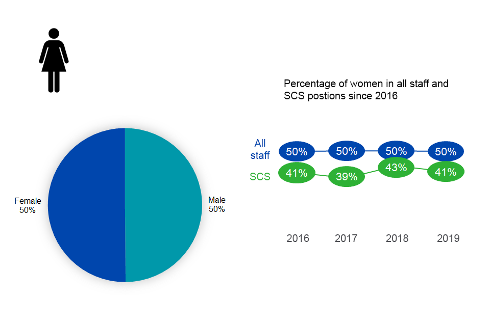 Our gender profile has remained stable across the period 2016-2019 with an equal gender balance for all staff and women representing 41% of SCS.