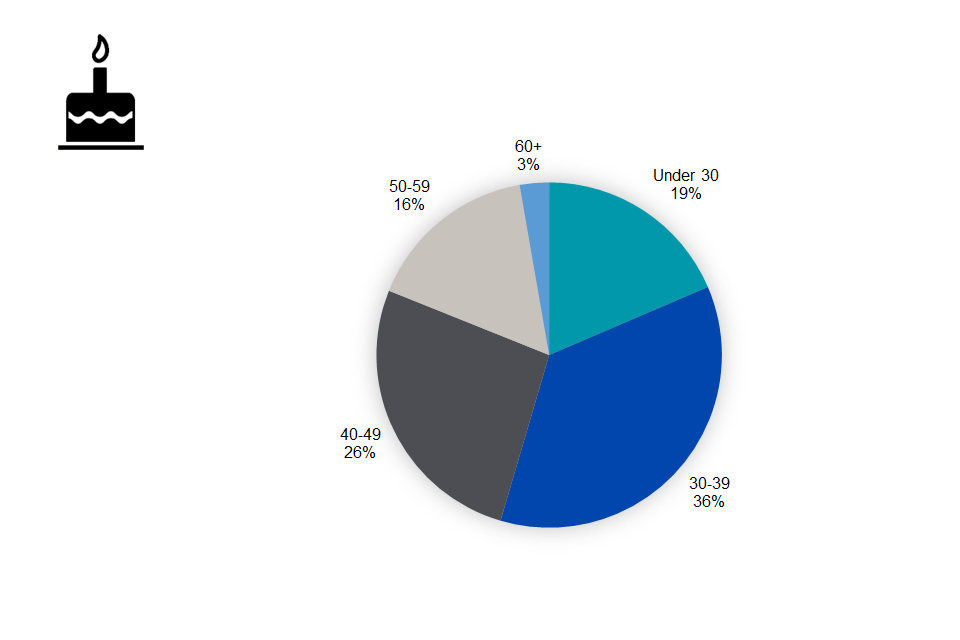 Pie chart showing that 36% of CMA staff are between the ages of 30 and 39, 26% are between ages of 40 and 49, 19% are under 30, 16% are between the ages of 50 and 59, and 3% are 60 or older.