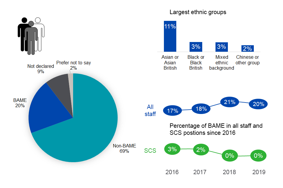 69% of CMA staff identify as non BAME. 20% identify as BAME. 9% are not declared and 2% prefer not to say. Of all CMA staff 17% identified as BAME in 2016, 18% in 2017, 21% in 2018 and 20% in 2019.