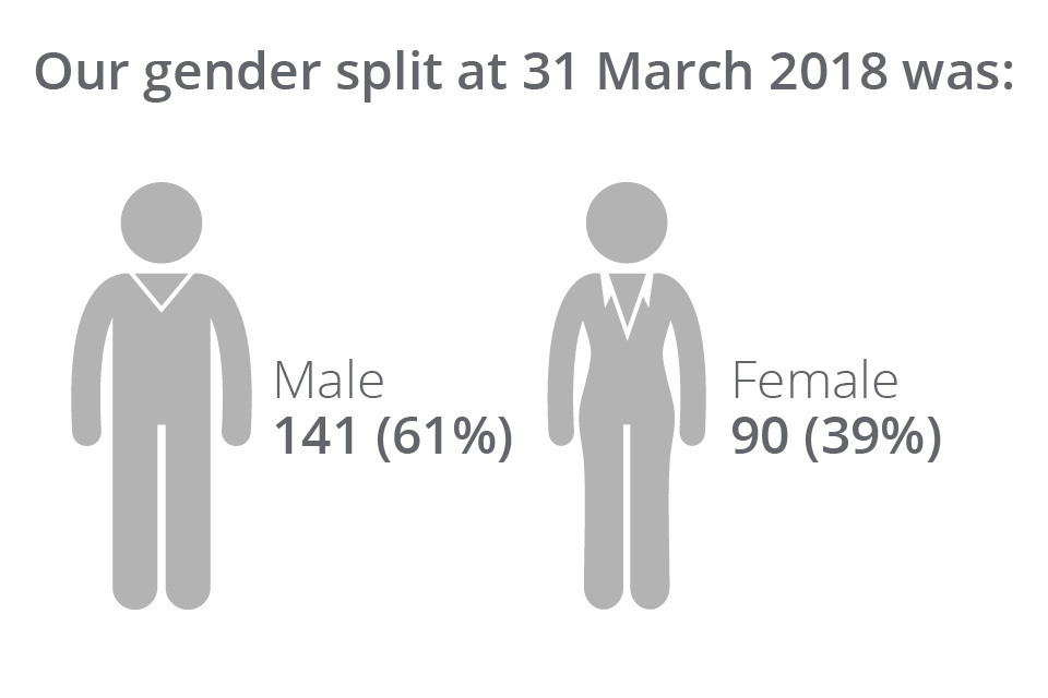 Gender split at 31 March 2018 was: Male 141 (61%) Female 90 (39%)