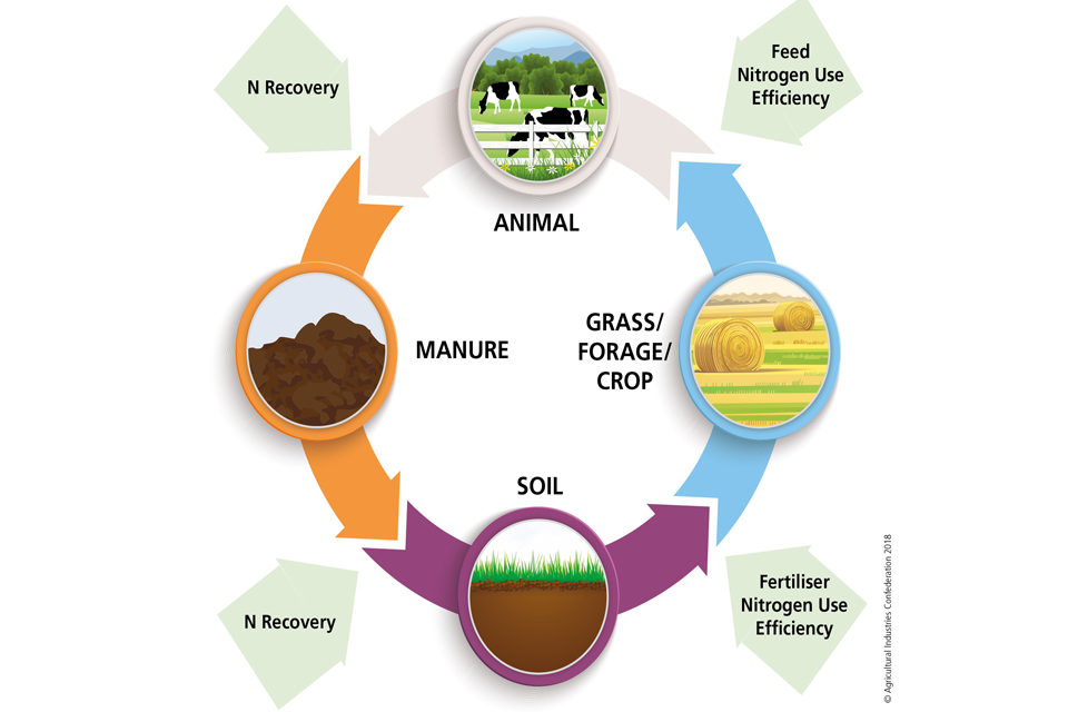 Figure 2: The nutrient loop. Nitrogen needs to be preserved at each stage of the farming process. Nitrogen Use Efficiency (NUE) is a unit of efficiency used in livestock or crop production. NUE is increased by increasing farm output per unit of nitrogen input. Image credit: © Agricultural Industries Confederation