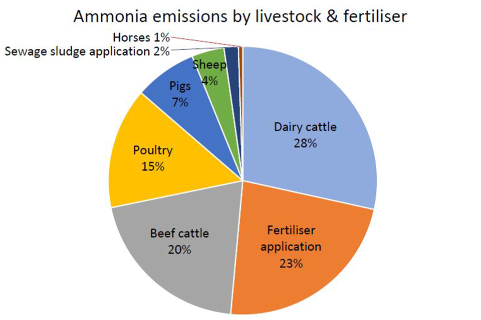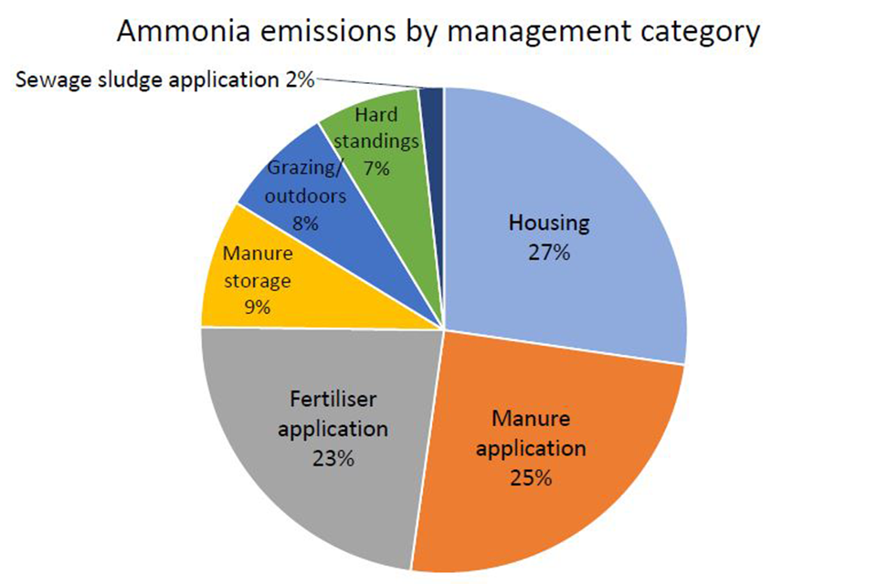 Ammonia (NH3) is a key air pollutant that can have significant effects on both human health and the environment. Agriculture is the dominant source of ammonia emissions in the UK, with the sector accounting for around 88% of total UK emissions. Most ammonia comes from livestock manures in animal housing and stores, and when manures and nitrogen fertilisers are applied to land.