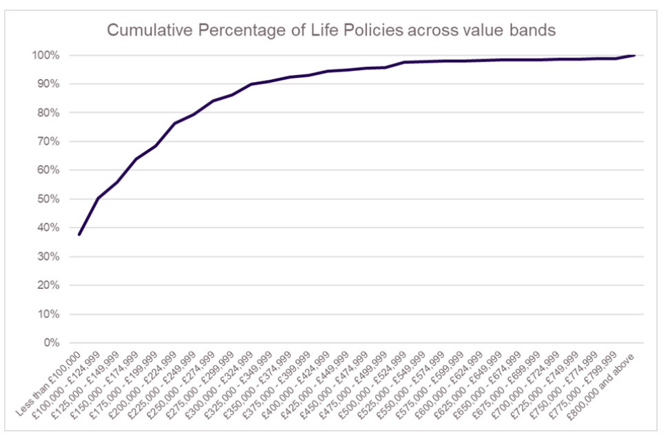 The graph shows the cumulative percentage of life insurance policies as the policy value increases. 38% of life insurance policies are less than £100,000 in value, and the figure gradually increases such that 96% of all life insurance policies are for a value of lower than £500,000. After £500,000 the increase is more gradual until it reaches 100%.