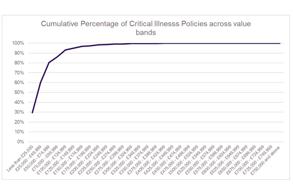 The graph shows the cumulative percentage of critical illness policies as the policy value increases. 29% of life insurance policies are less than £25,000 in value and the figure gradually increases such that 99% of all critical illness policies fall below the value of £300,000 per year. After this point the figure increases only marginally until it reaches 100%.