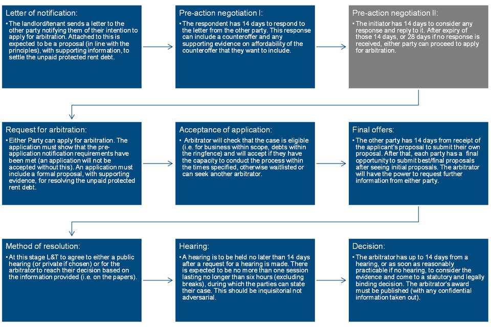 - The landlord/tenant sends a letter to the other party notifying them of their intention to apply for arbitration. Attached to this is expected to be a proposal (in line with the principles), with supporting information, to settle the unpaid protected rent debt.