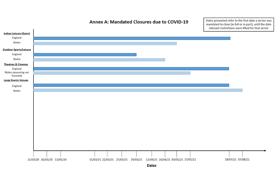 31. This means premises that were able to continue trading and were not forced to close, for example pharmacies, are not within scope of the legislation. A summary of the ringfenced periods and the businesses affected can be found in Annex A to this code. For example, for a clothing shop in England the ring-fenced period ran from 21 March 2020 to 12 April 2021 (when non-essential retail was allowed to re-open); and for a café in England the ring-fenced period ran from 21 March 2020 to 18 July 2021 (when restrictions ended on table booking size and requirement for customers to eat while seated).