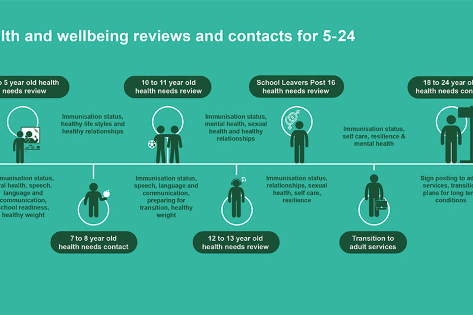 For school-aged children and young people, suggested contacts are at key development stages or transition points. This includes helping children aged between 7 to 8 years to become more resilient and improve their emotional wellbeing. Delivering evidence-based interventions including human papillomavirus (HPV) and other immunisation programmes are offered within the teenage years; and at 19 to 24 years supporting young people as they move into adulthood and become more autonomous or require support in managing their health and care needs.