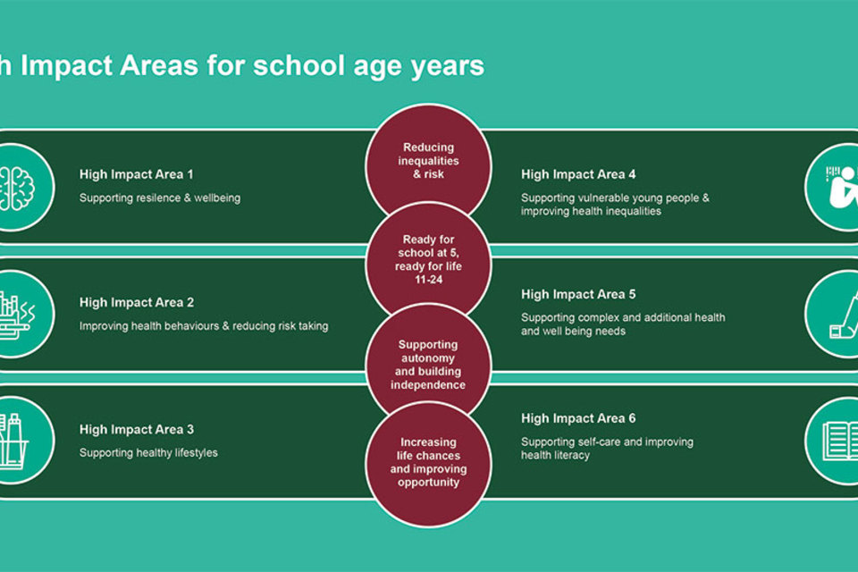 Figure 7 lists the 6 high impact areas and how they relate to the 4 aims for school age children and young people, namely to:
