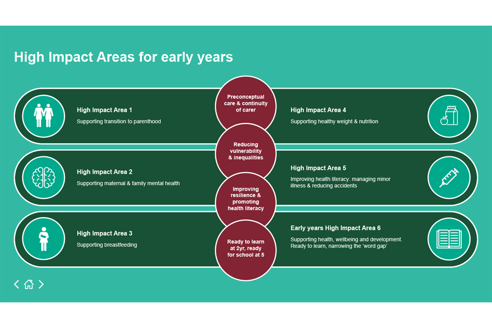 The High Impact Areas, with additional information for maternity, provide an evidence-based framework for those delivering maternal and child public health services from preconception onwards. They are central to the health visitor and school nurse delivery model. These have been refreshed and contain new evidence, policy and suggested additional material to support implementation.