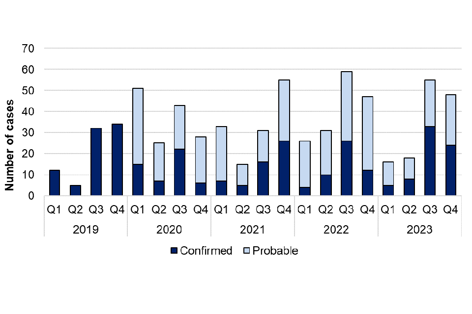 In the fourth quarter of 2023, 19 (79%) confirmed cases were male (aged 18 to 80 years, median 47 years) and 5 (21%) were female (aged 25 to 63 years, median 45 years). Cases were reported in Yorkshire and Humber (n=7), the North West (n=5), West Midlands (n=4), South East (n=3), South West (n=3) and the London region (n=2).
