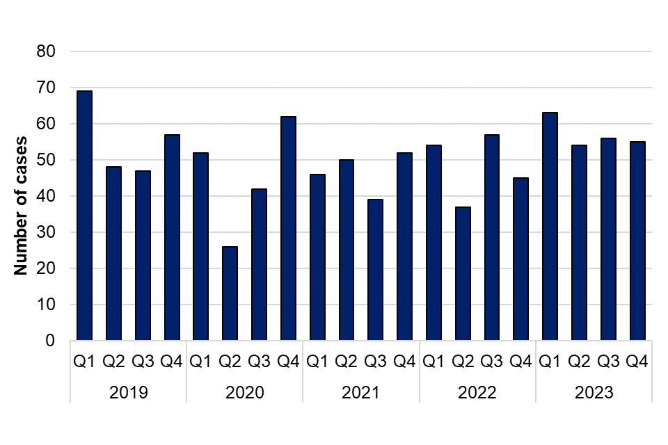 Figure 2. Laboratory-confirmed cases of leptospirosis in England by quarter, Q1 2019 to Q4 2023