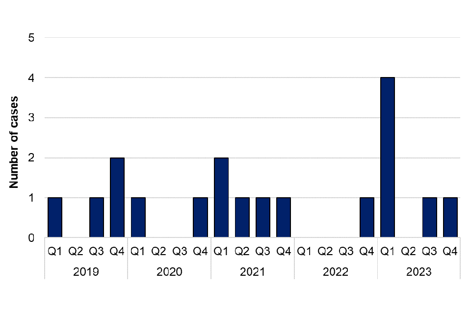Figure 5. Laboratory-confirmed cases of psittacosis in England by quarter, Q1 2019 to Q4 2023