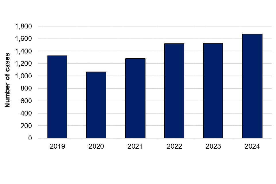 Figure 1. Laboratory confirmed cases of hepatitis E in England by year, 2019 to 2024