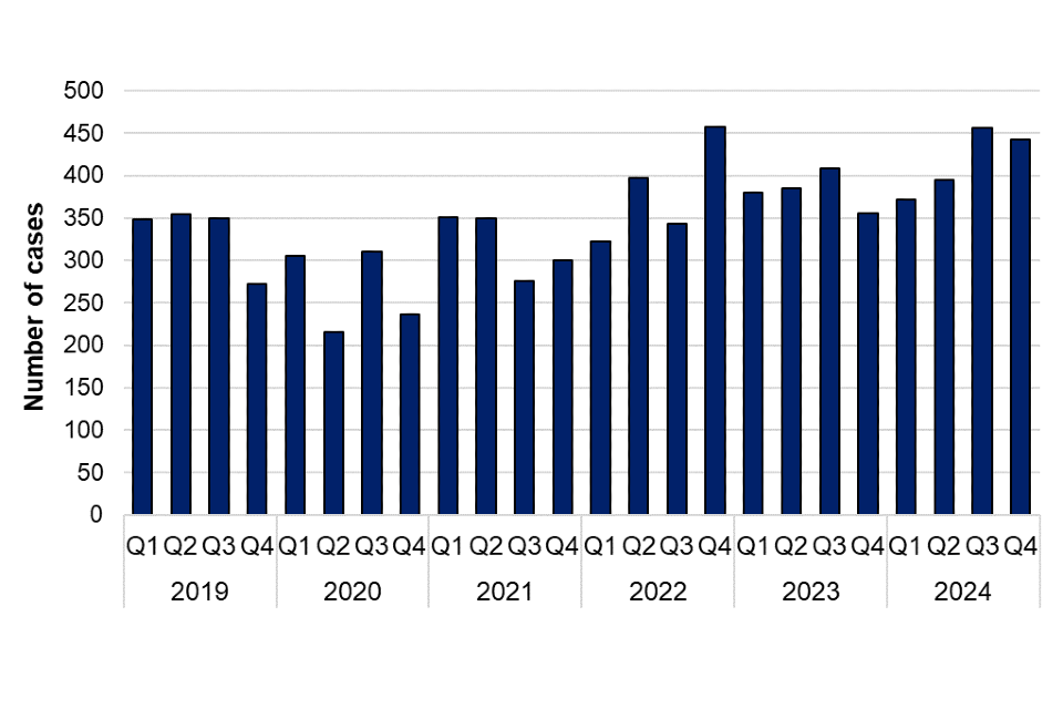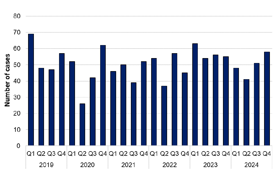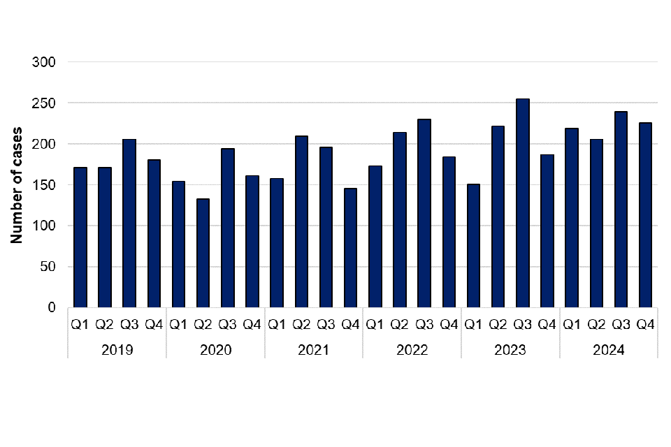 Figure 2. Laboratory confirmed cases of hepatitis E in England by quarter, Q1 2019 to Q4 2024