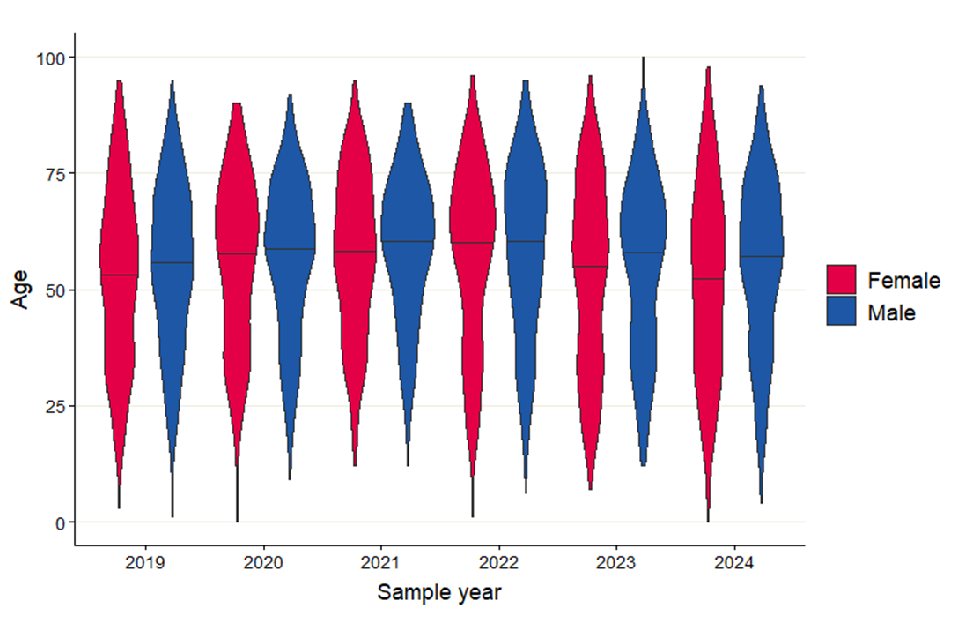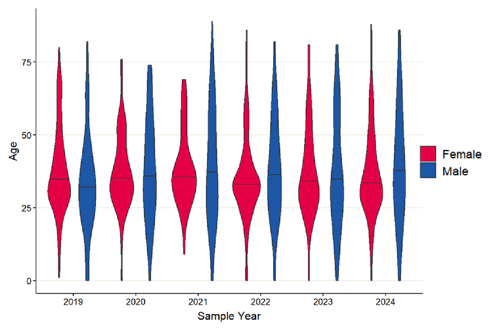 Figure 3. Violin plot of laboratory confirmed cases of Hepatitis E in England by age and sex, 2019 to 2024. Line represents median age for each sex by year