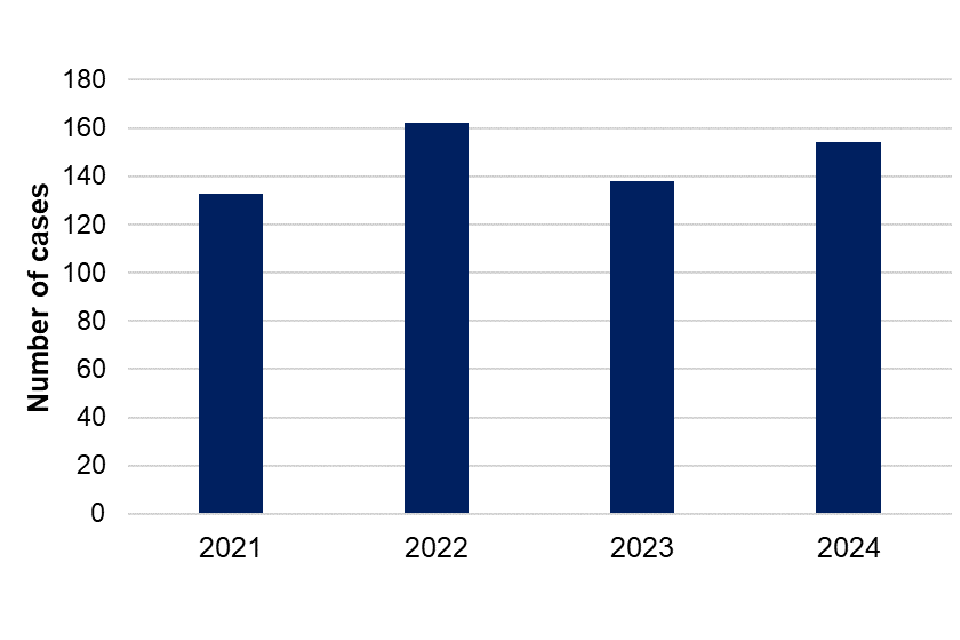 following a change in diagnostic testing for Brucella canis, and review of brucellosis data since 2022, case definitions for brucellosis have been updated from 2022 onwards. Brucellosis cases in 2024 have increased compared with previous years. This increase is primarily in travel-related B. melitensis or B. abortus cases