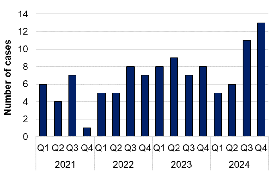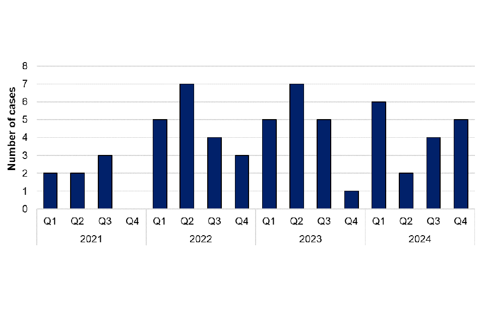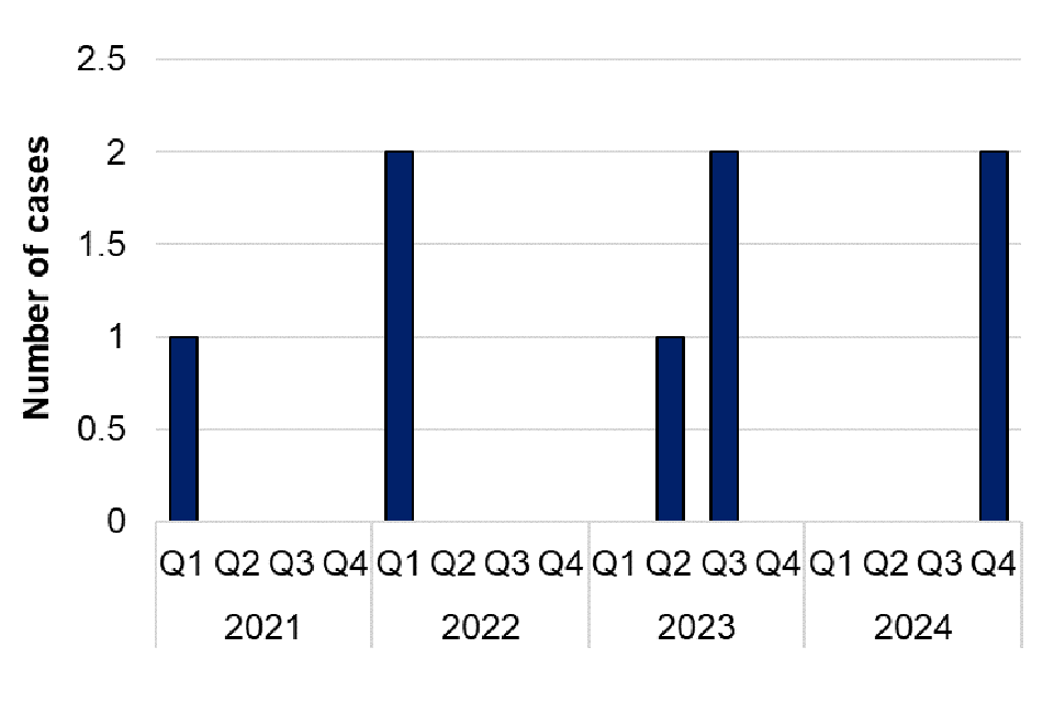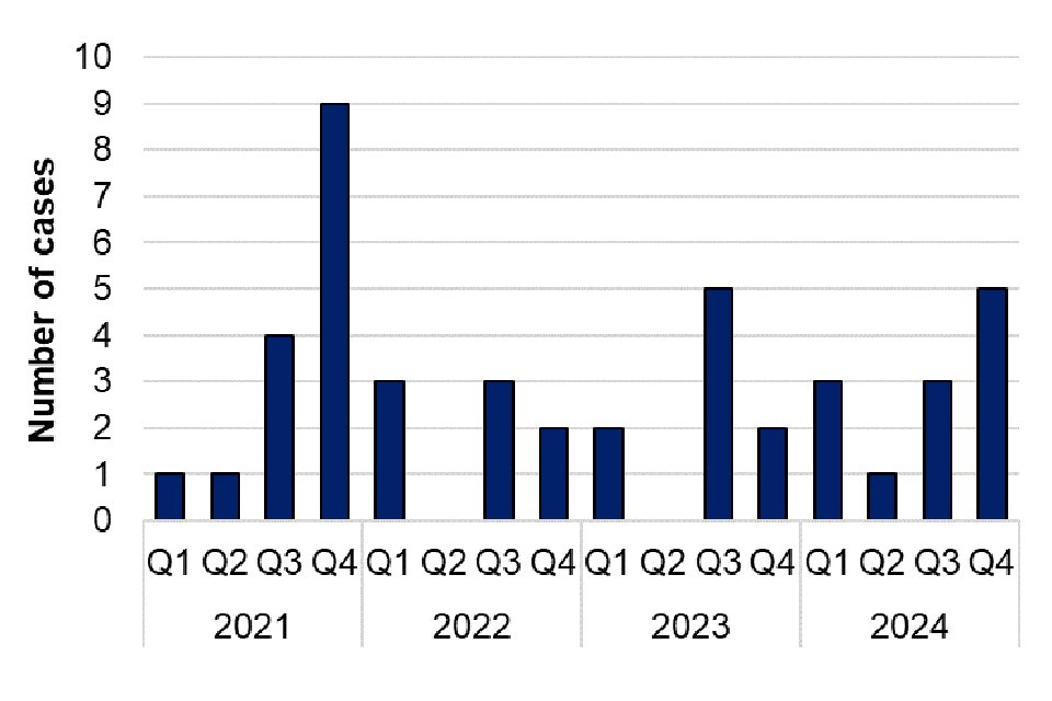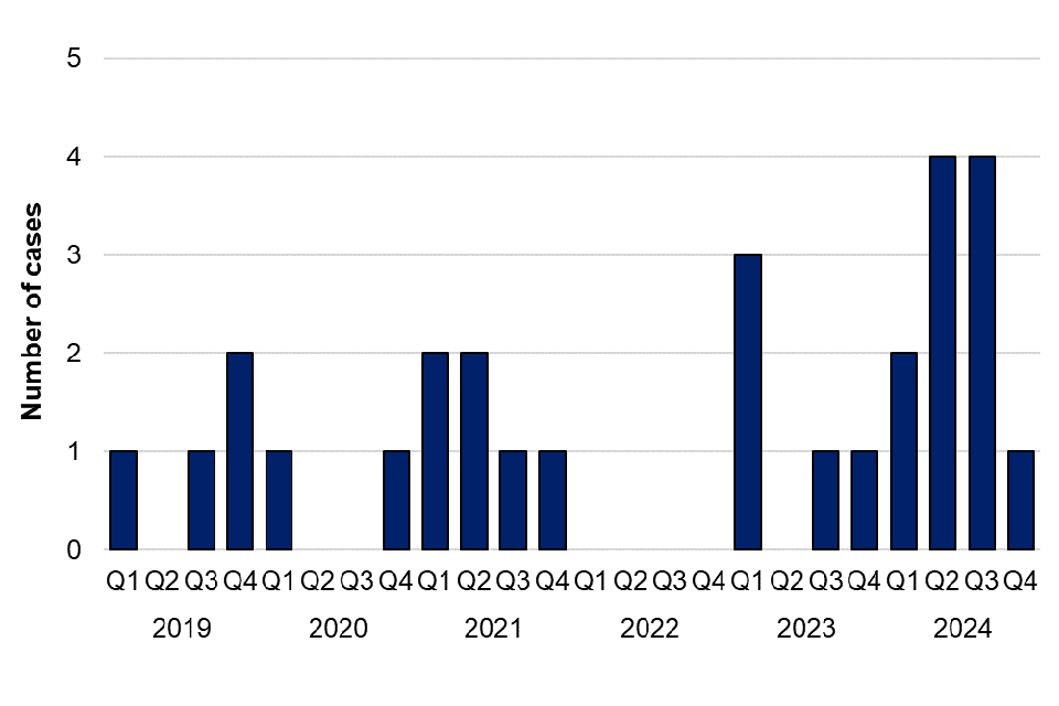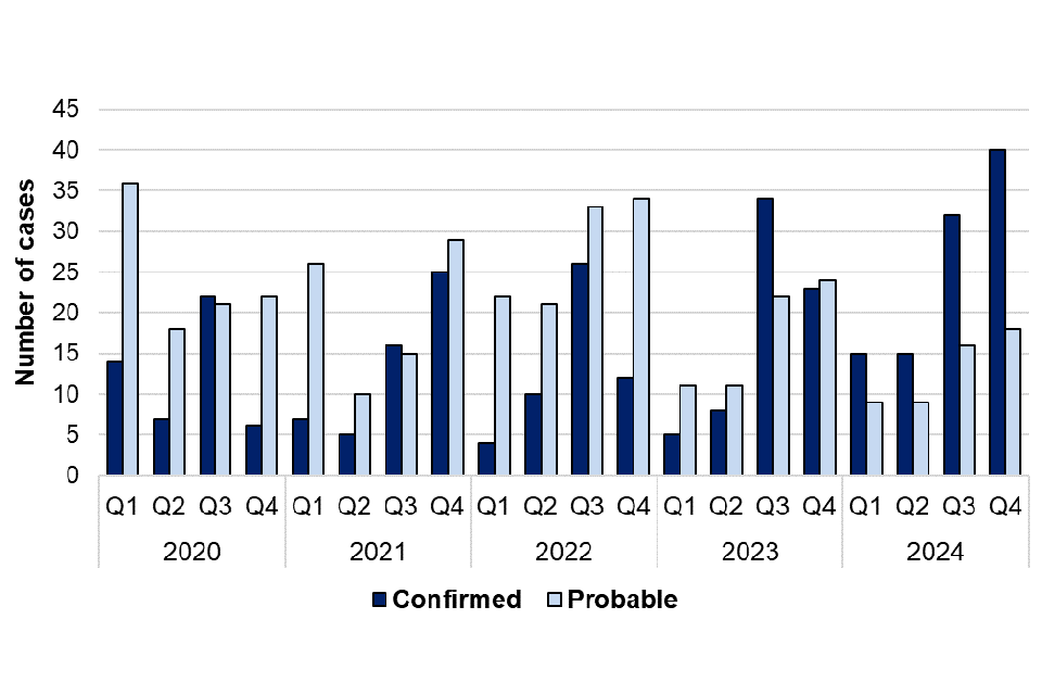Figure 9. Laboratory confirmed cases of C. psittaci or C. abortus in England by quarter, Q1 2019 to Q4 2024
