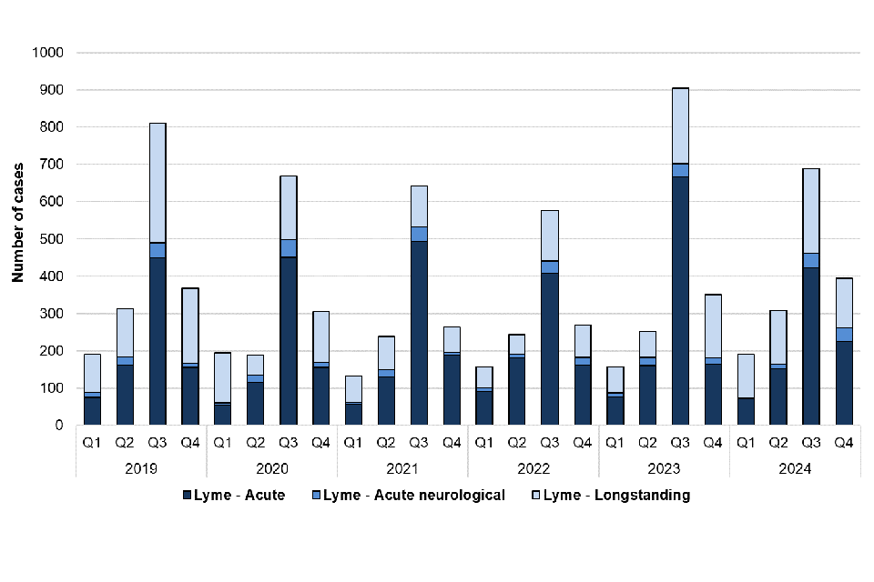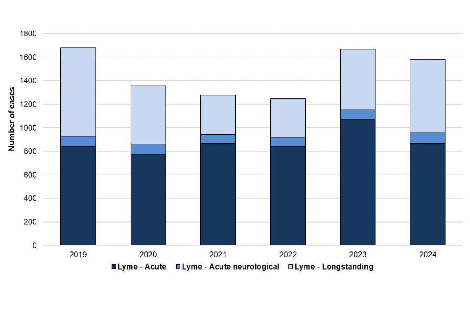there has been a small reduction in total laboratory-confirmed Lyme disease cases in 2024 compared with 2023. Most confirmed cases in 2024 were reported from the South West, South East and London regions, which has remained consistent over the last 5 years