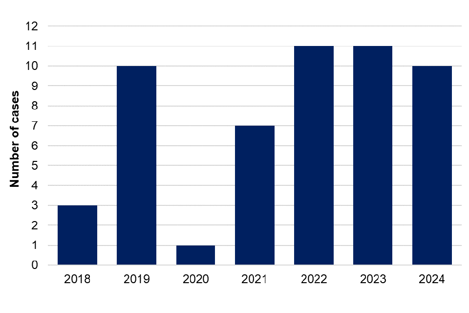 Figure 10. Laboratory confirmed cases of toxigenic Corynebacterium ulcerans in England by year, 2018 to 2024
