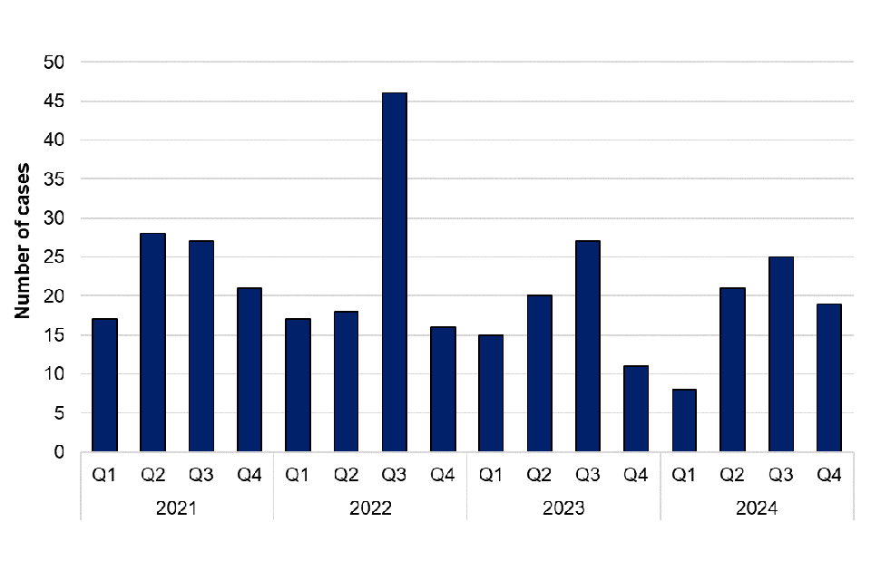 Figure 14. Laboratory confirmed cases of Mycobacterium marinum in England by quarter, Q1 2021 to Q4 2024