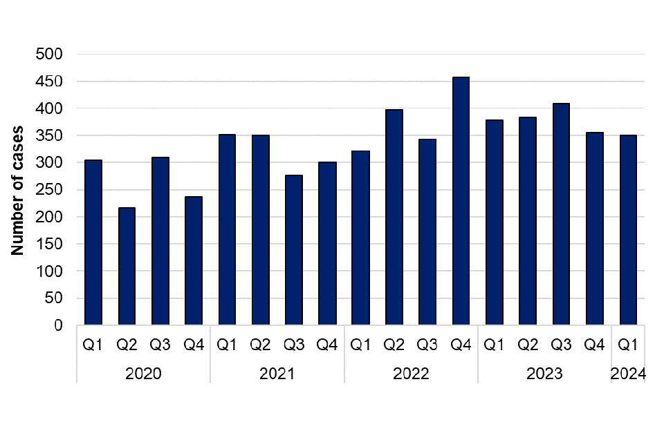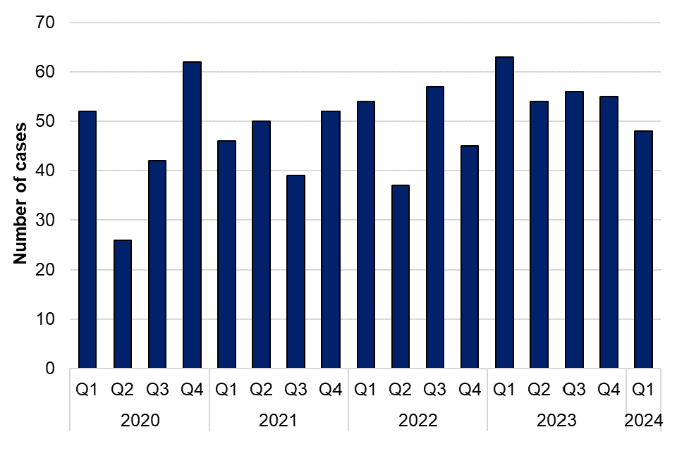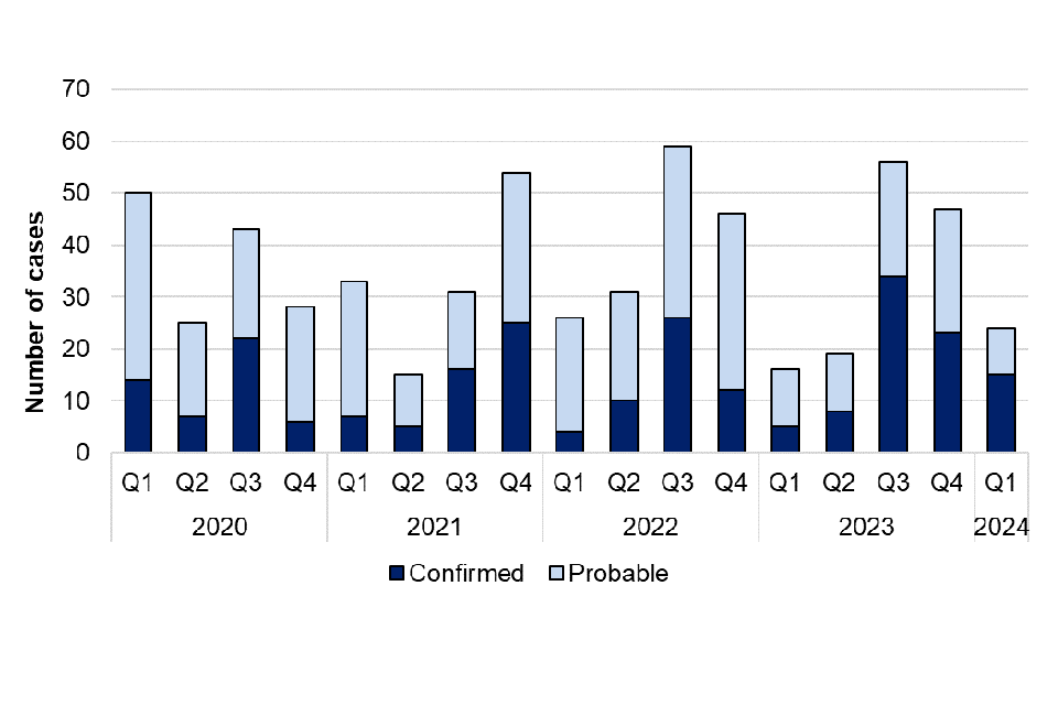 Figure 2. Laboratory-confirmed cases of leptospirosis in England by quarter, Q1 2020 to Q1 2024