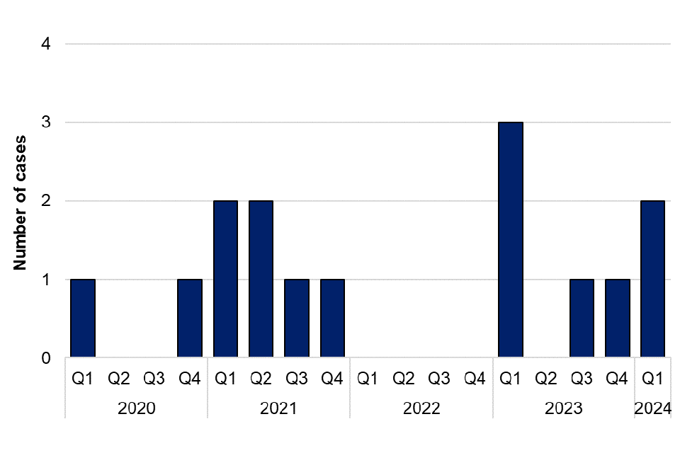 Figure 5. Laboratory-confirmed cases of Chlamydia psittaci / Chlamydia abortus in England by quarter, Q1 2020 to Q1 2024