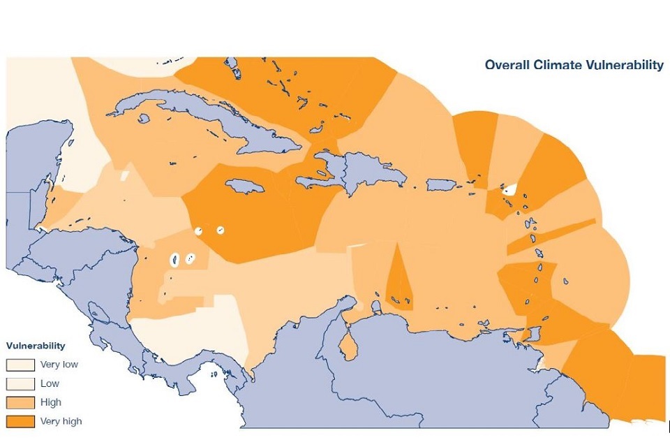 Overall Climate Vulnerability of the fisheries sectors in 33 Caribbean countries or territories. Each country is delimited by its EEZ boundary. Redrawn from Monnereau et al. (2015). These boundaries are subject to some objections which have been submitted to the UN.