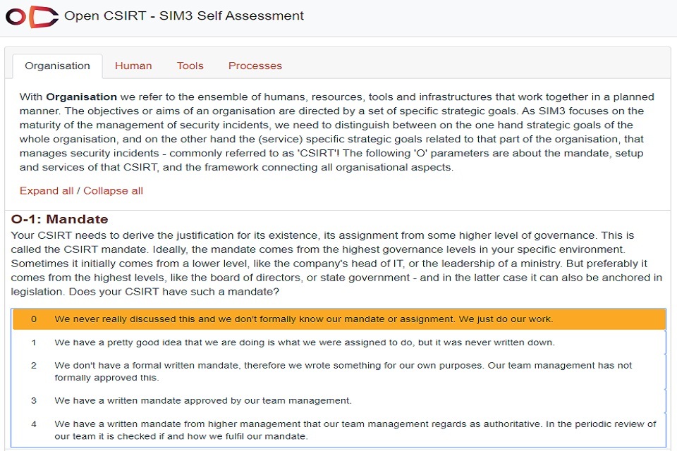 Shows the Open CSIRT Foundation (OCF) online self-assessment tool for SIM3 which all types of CSIRTs can use. The tool uses 44 parameters in 4 categories to measure maturity of the organisation’s function: organisation, human, tools and processes.
