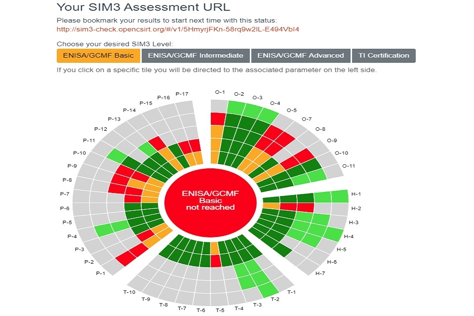 Looking at the example in Figure 2, just above the results ‘circle’ there are four selectable tabs which show the desired SIM3 levels of ‘ENISA/GCMF Basic’ through to ‘TI Certification’. In the image above this is currently selected to ‘ENISA/GCMF Basic’, so the results are indicating the current levels of maturity against meeting the ENISA/GCMF Basic level. The results show that the CSIRT has selected a score of two for Parameter O-1: Mandate, but the colours indicate that the required score to meet ENISA/GCMF Basic is actually three. Similarly, the results show that the team has scored four on the parameters of O-2: Constituency, O-3: Authority and O-4: Responsibility, and this exceeds the ENISA/GCMF Basic requirement of three.