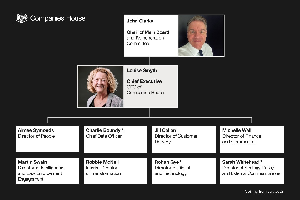 The Chief Executive and Registrar and all executive directors of the business constitute the executive board. The main board of Companies Houses consists of the chair, the chief executive, executive directors and non-executive board members, and: