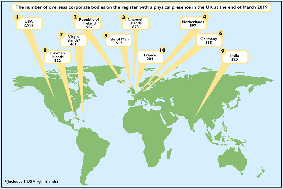 At the end of March 2019, there were 11,773 overseas corporate bodies on the total register. Overseas corporate bodies are incorporated outside of the UK but have a physical presence in the UK (such as a place of business or branch) through which they carry out their business. Since 2013-14, the number of overseas corporate bodies on the total register has increased by 1,355.