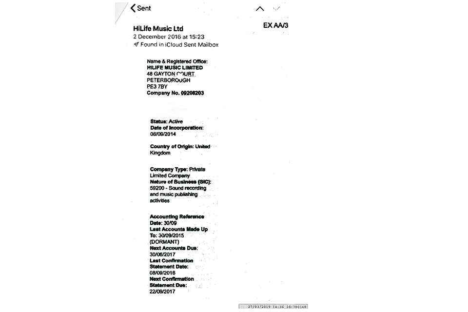 25. Ms Atiemo states that she ensured that she carried out due diligence prior to registering her company names. As part of due diligence, she states that she carried out a search at Companies House and also requested her accountant, Harry Koranteng, to carry out a search, just to be sure. Ms Atiemo states that Mr Fife’s company had not filed accounts since its incorporation in 2014 to December 2016, when the due diligence searches were done. She explains that the Companies House checks also revealed that there were other companies with “HILIFE” as part of their names. Exhibit AA/3 comprises a print of Mr Fife’s company registration details from the register of companies. This appears to be the print from the search at the time it was done because there is a date of 2 December 2016, timed at 15.23 and the text “found in iCloud Sent Mailbox”: