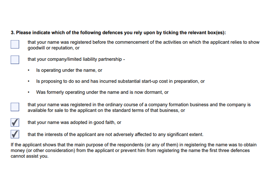 35. I note that Mrs Kemp, in the counterstatement, refers to her company owning three ice cream vans and selling ice cream from the vans; and that she was willing to sell the company and cease trading. She did not tick the defence of operating under the name or the defence that the company is proposing to operate and has incurred substantial start-up cost in preparation. I have considered whether her comments amount to such a defence. Firstly, the primary respondent made a conscious decision about which defences it wished to rely upon. Secondly, without more detail, and corroborative evidence of operating under the name such as photographs, invoices for stock, advertising, etc, the aforementioned references, when the operating defence was not ticked, cannot be taken into account. Even if it had been ticked, what has been stated in the counterstatement is insufficient to support such a defence.