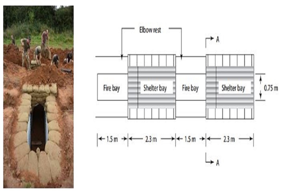 The current technologies for in-field temporary fortifications for dismounted soldiers are reaching the end of their natural life. Traditionally, they have consisted of corrugated iron, concrete bollards and sandbags, as depicted in Figure 1, to provide structural support and overhead protection in the 4-Man Battle Trench. Current dimensions for the 4-Man Battle Trench are 0.75 m wide x 1.5 m deep x 7.75 m long but given the additional equipment soldiers now carry, a 25% increase on width would be beneficial.