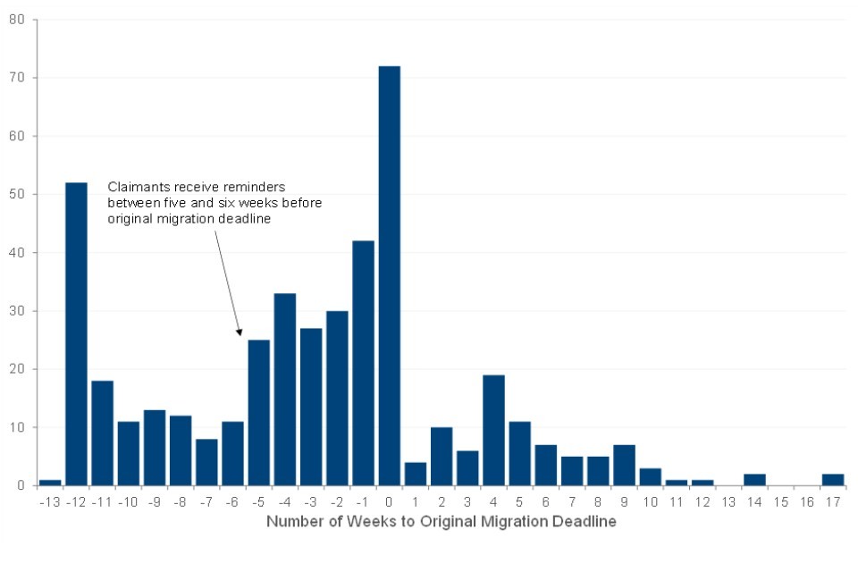 The points at which claims were made over the migration period within the ETS cohort revealed a pattern of claimant behaviour that shows peaks of claiming corresponding closely to the issuing of the initial Migration Notice, the reminder notifications and the claim deadline (see Chart 2). It also shows that a significant proportion of claimants delay taking action until close to the Migration Notice deadline.