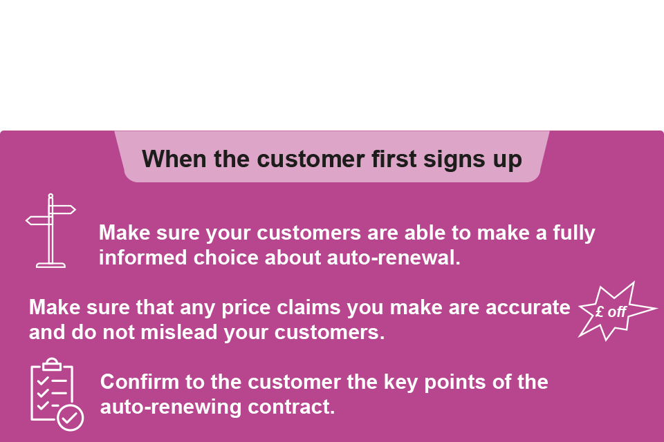 Before your customer enters into an auto-renewing contract, give them clear and prominent information about auto-renewal, including: how much they will be charged for the product upon renewal, the length of the renewed contract period and how auto-renewal works.