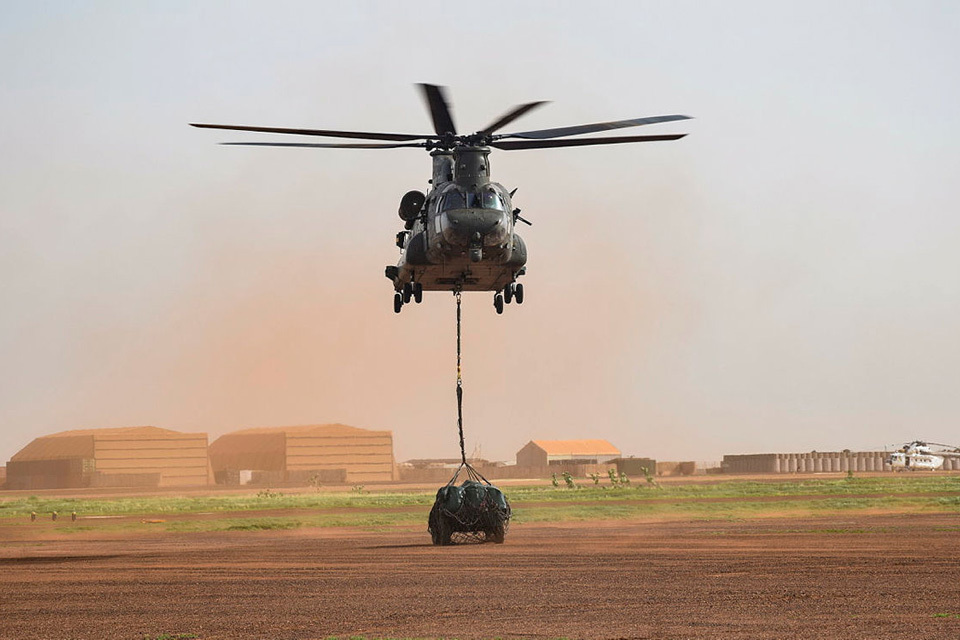 RAF Chinook helicopter lifting a French Army Panhard all-terrain vehicle as part of UK support to the UN operation in Mali. Credit: Provided by the Ministry of Defence, UK MOD © Crown copyright 2021.