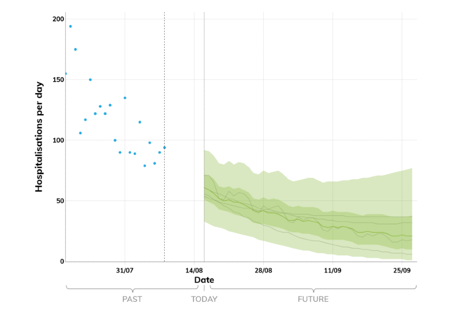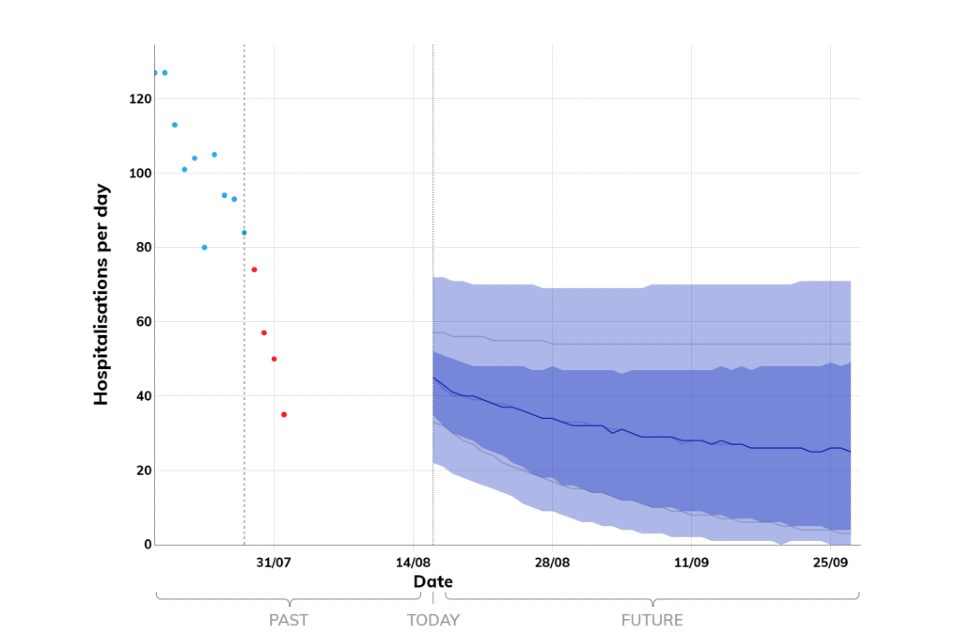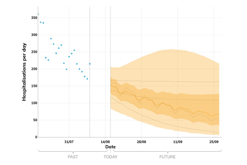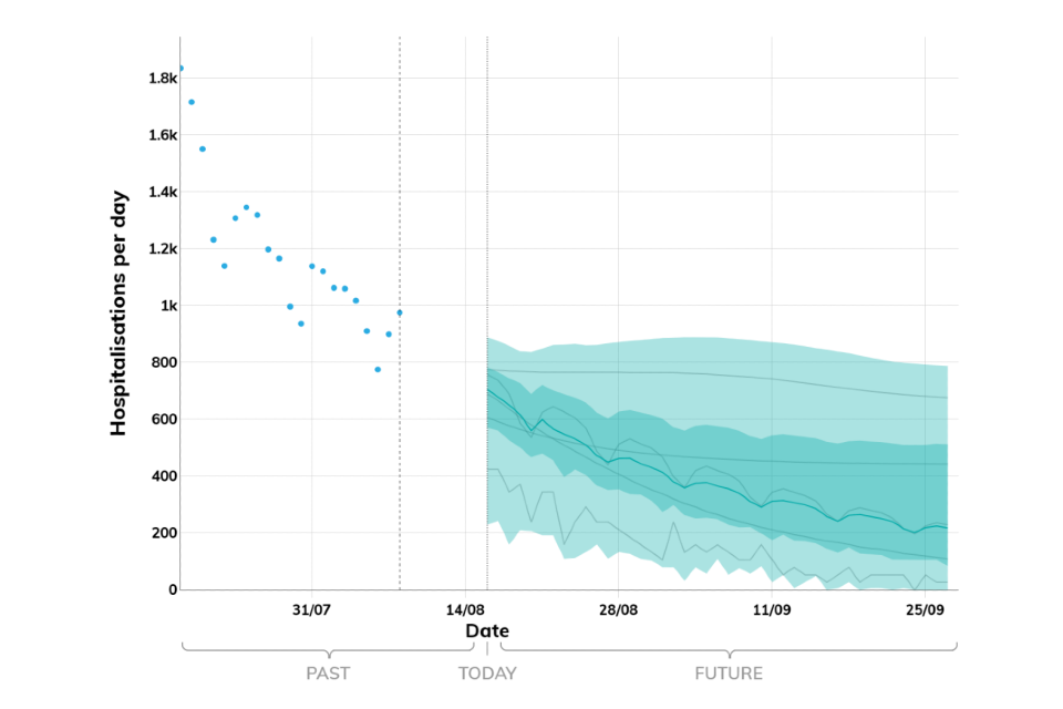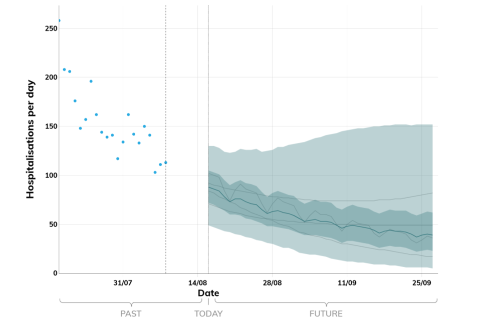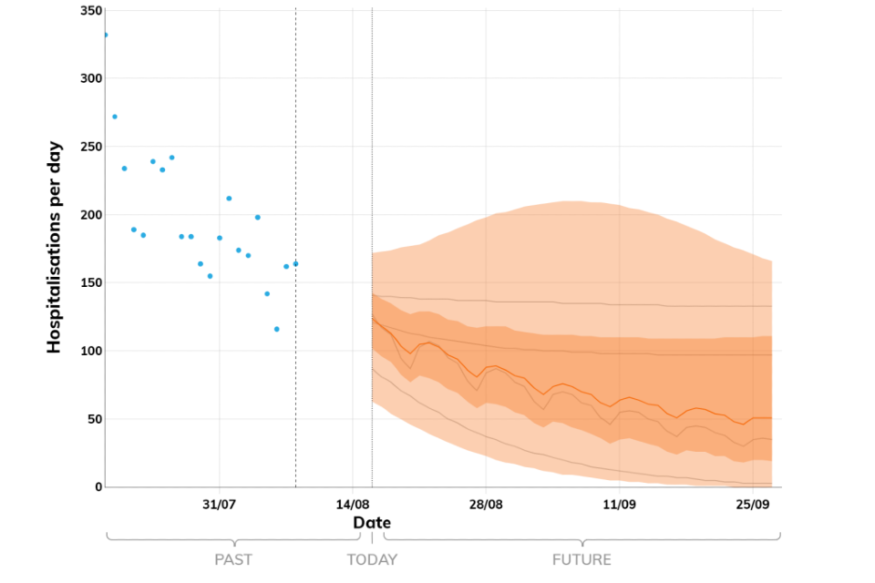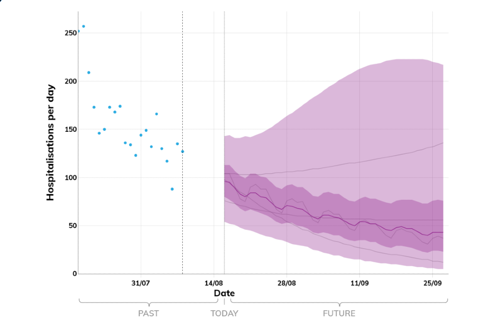 Projections do not include the potential effects of any novel variants. The delay between infection, developing symptoms, the need for hospital care, and death means it is unlikely that a novel variant will significantly alter the trajectories of hospitalisations and deaths in the timescales covered by these projections.