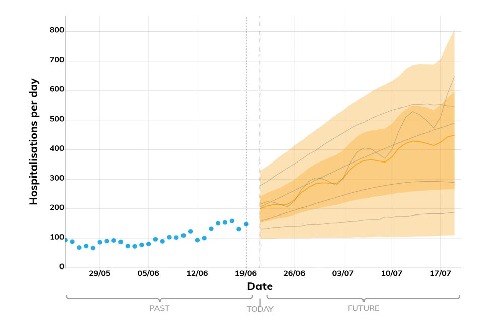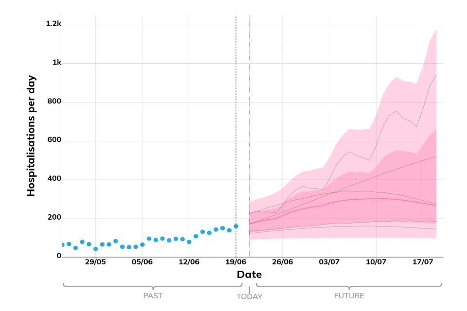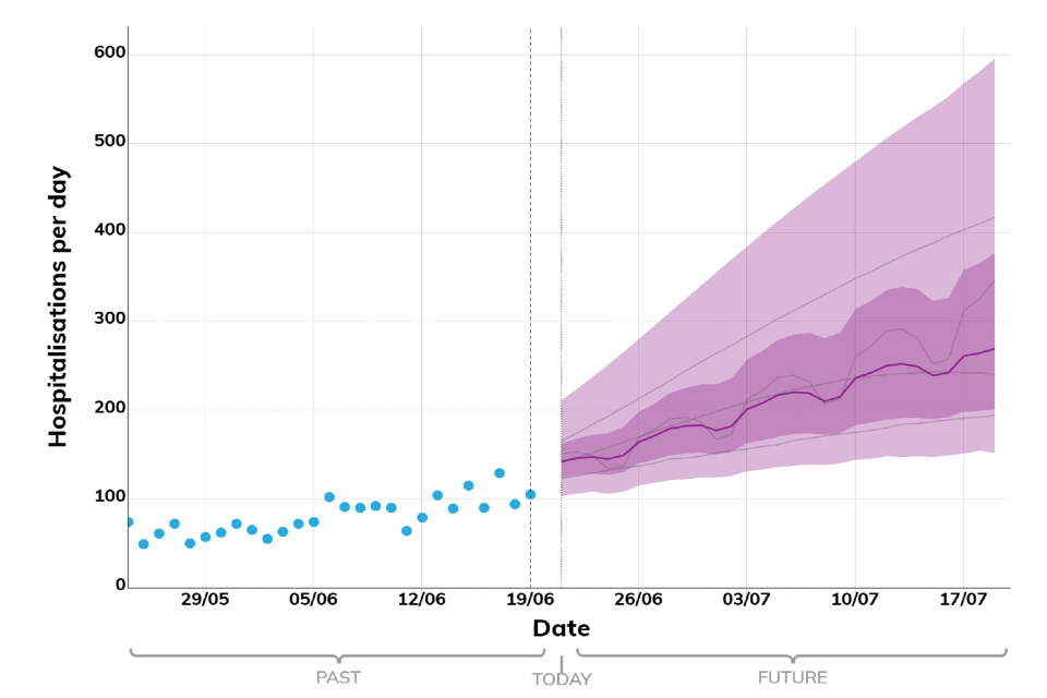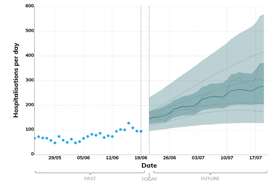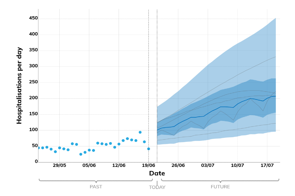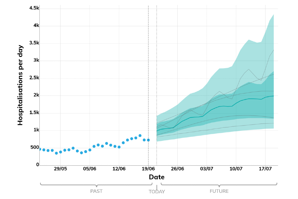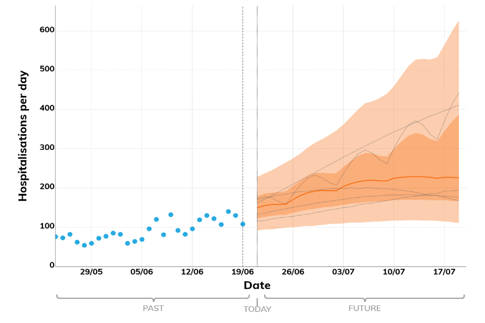 Several modelling groups produce their own set of projections. These individual projections are then combined to form consensus MTPs. MTPs are provided for England, Wales and Scotland, for hospital admissions* (Figure 1), MTPs are provided for deaths for England (Figure 2), and MTPs are provided for English regional hospital admissions (Figure 3).