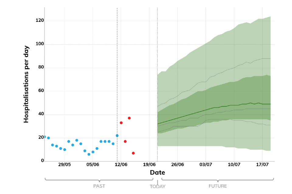 The delay between infection, developing symptoms, the need for hospital care, and death means the MTPs cannot fully reflect the impact of policy and behavioural changes in the 2 to 3 weeks prior to 20 June 2022. An assumed effect of school holidays has been included.