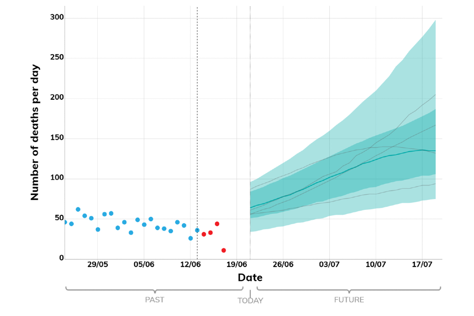 These medium-term projections (MTPs) for COVID-19 hospitalisations ± and deaths ¥ are not forecasts or predictions. They represent a scenario in which the trajectory of the epidemic continues to follow the trends that were seen in data available to 20 June 2022.