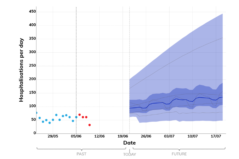 Projections do not include the potential effects of any novel variants. The delay between infection, developing symptoms, the need for hospital care, and death means it is unlikely that a novel variant will significantly alter the trajectories of hospitalisations and deaths in the timescales covered by these projections.