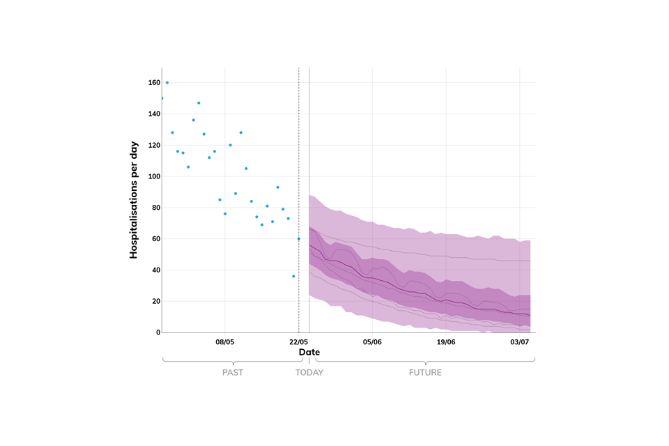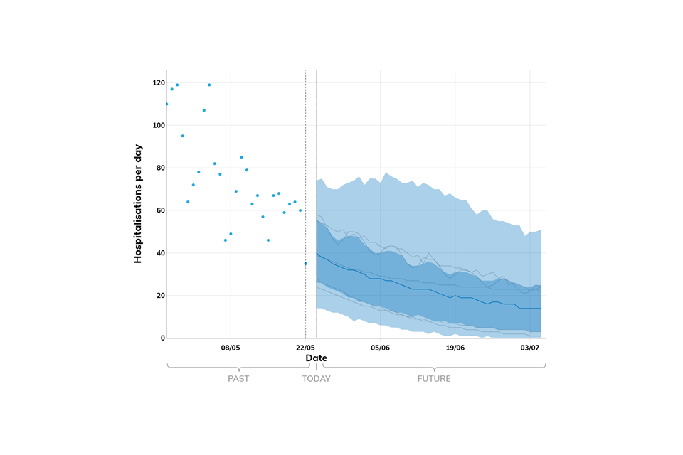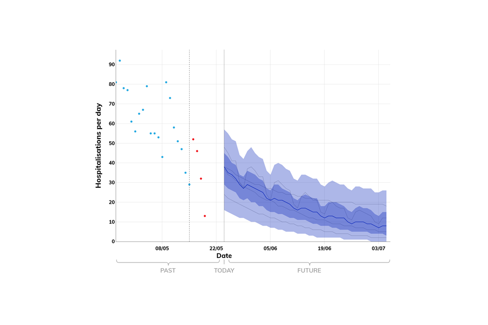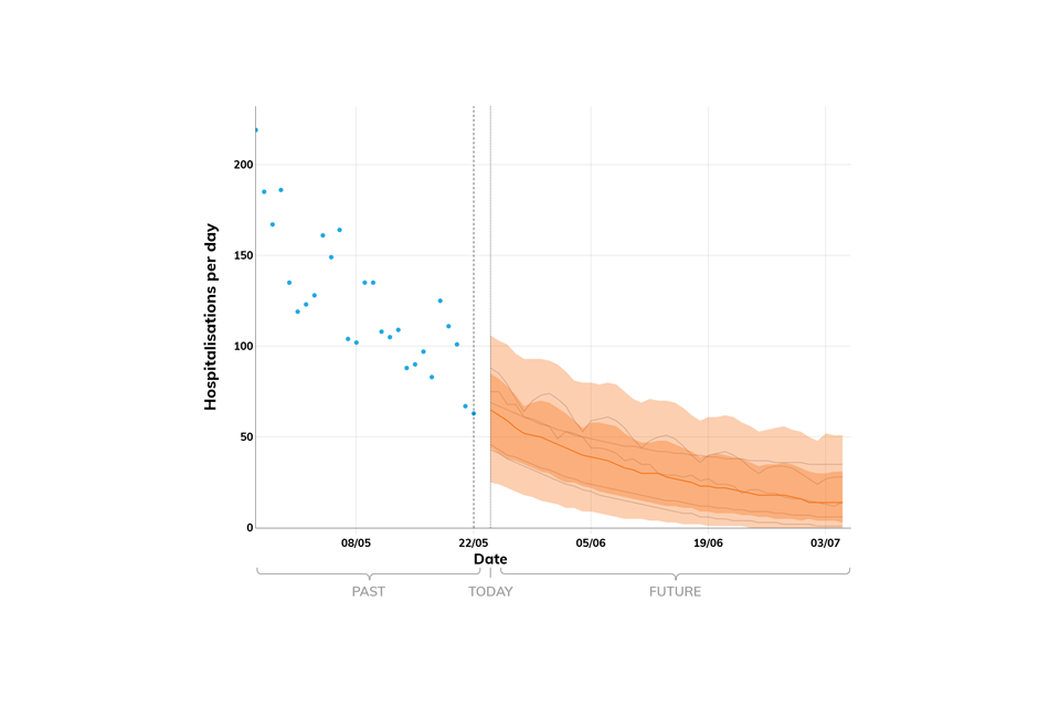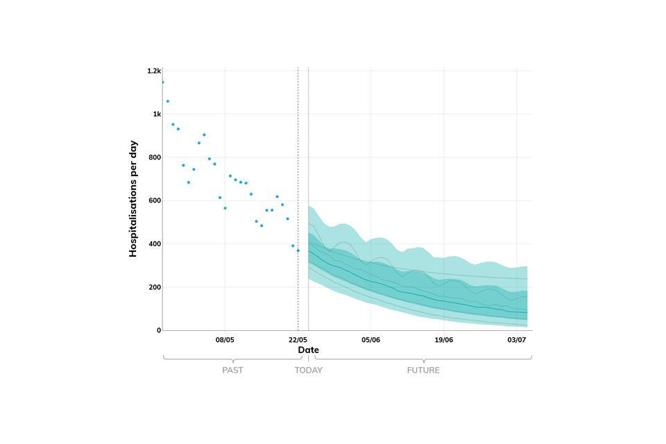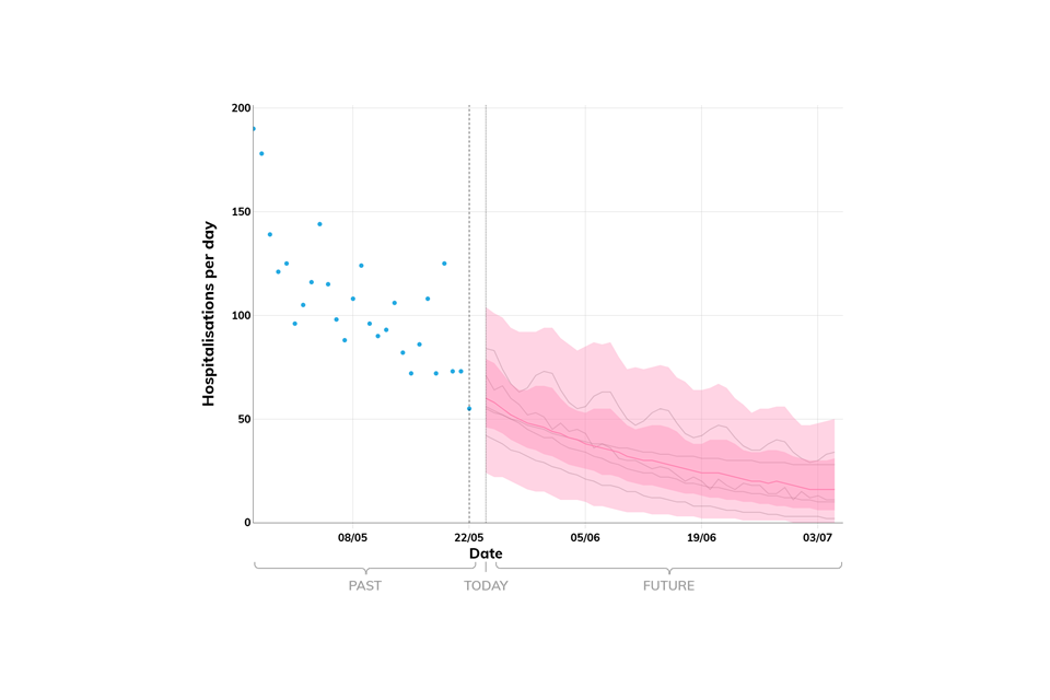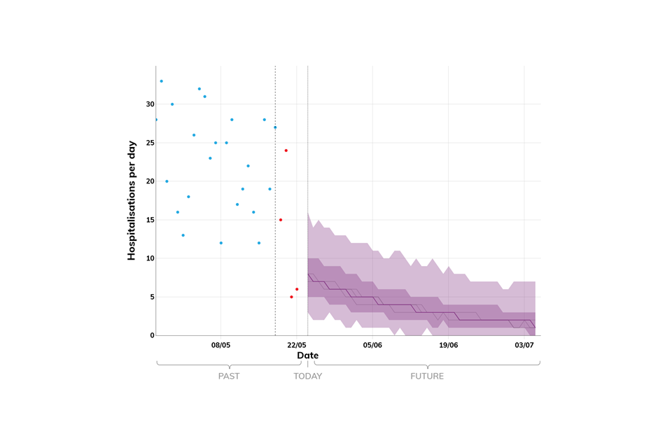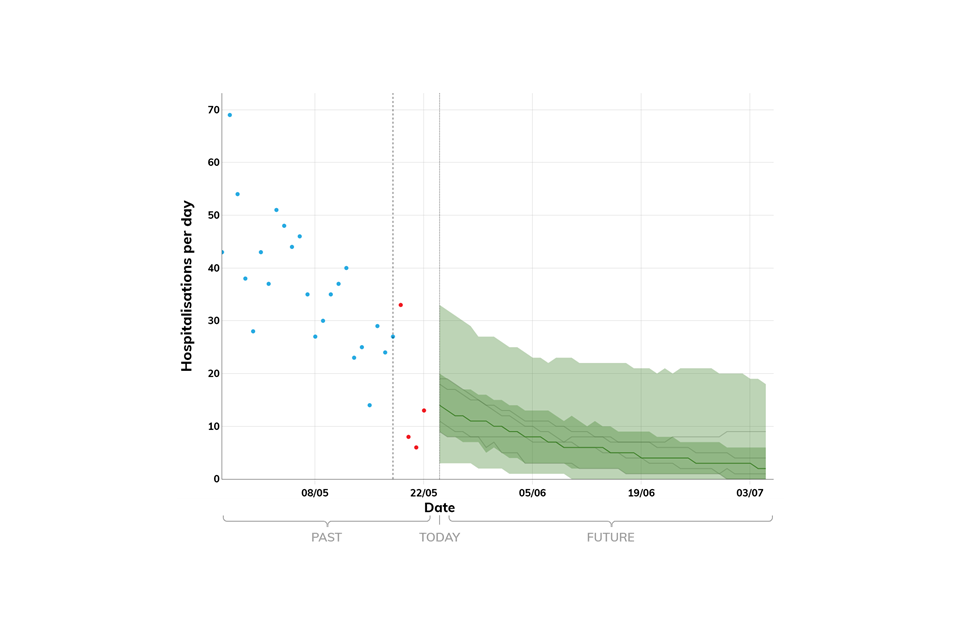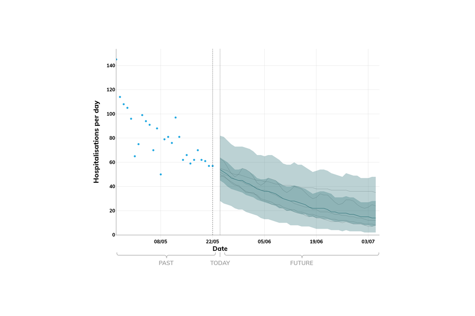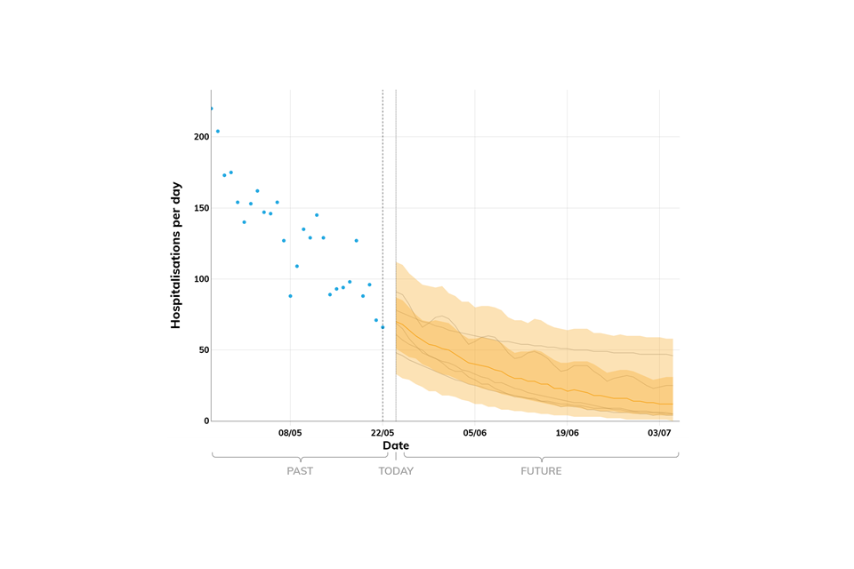 Projections do not include the potential effects of any novel variants. The delay between infection, developing symptoms, the need for hospital care, and death means it is unlikely that a novel variant will significantly alter the trajectories of hospitalisations and deaths in the timescales covered by these projections.
