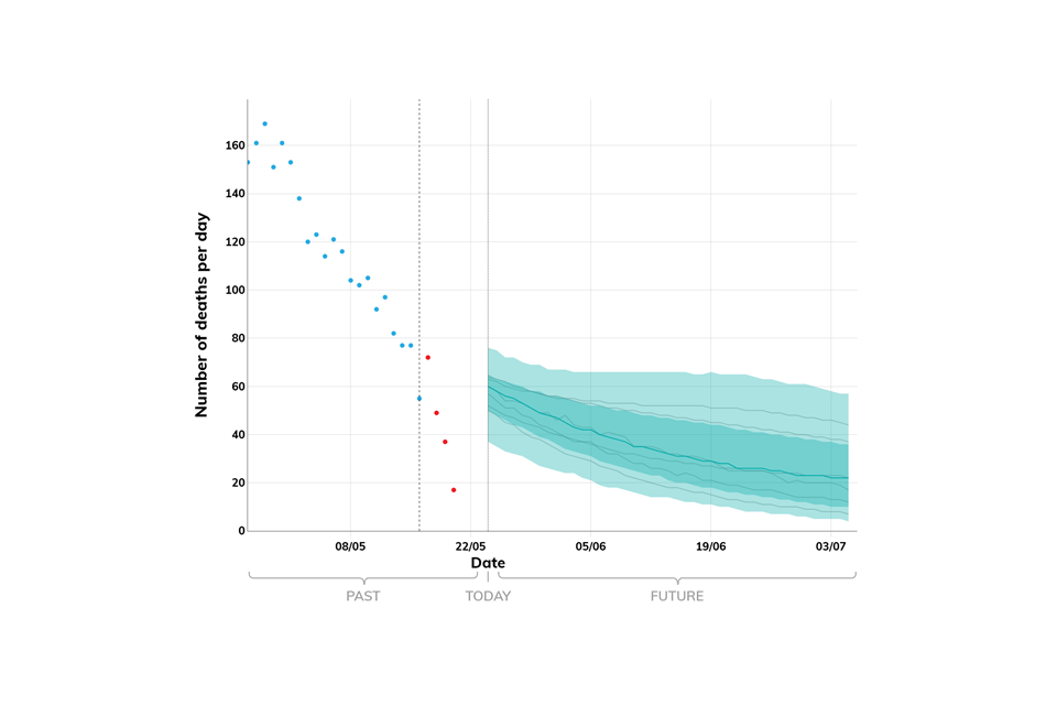 The number of deaths has fallen to very low levels in Scotland, Northern Ireland, Wales and in the English regions. Projecting forwards is difficult when numbers fall to very low levels, therefore projections for deaths are not provided for these nations and regions this week. However, the consensus view is that the number of deaths in these nations and regions will remain low over the next 6 weeks.