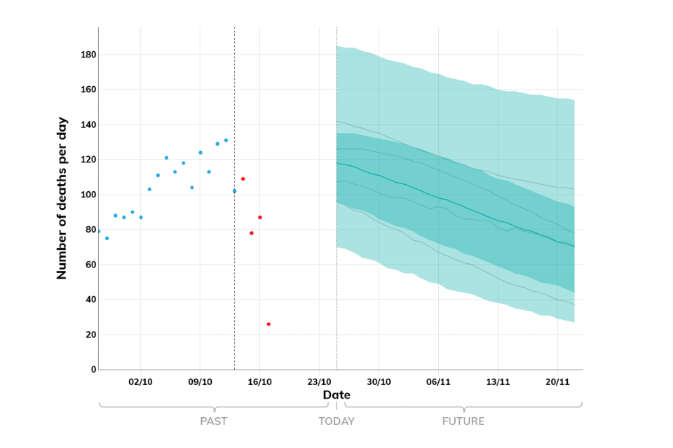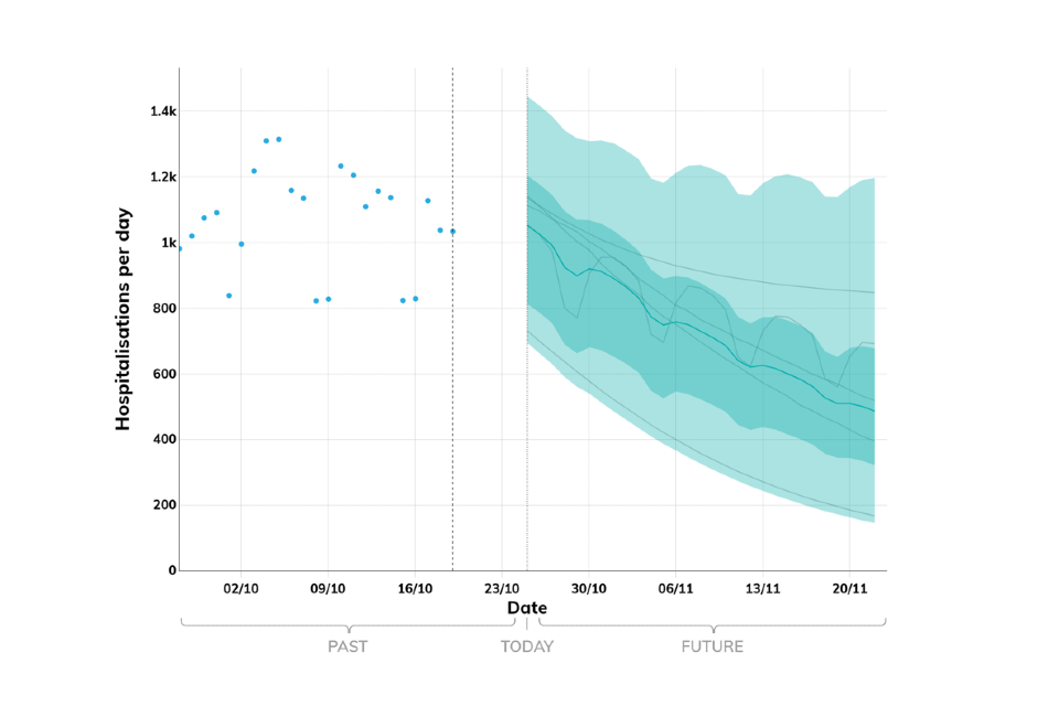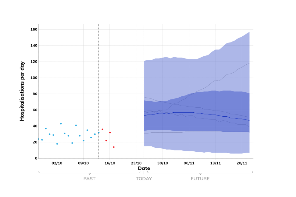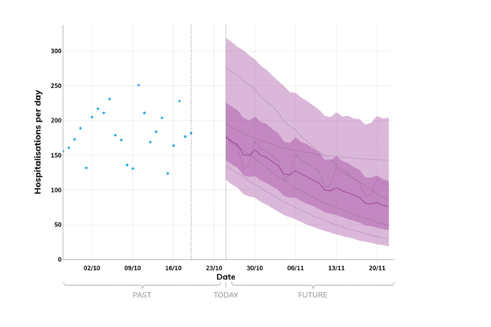 The delay between infection, developing symptoms, the need for hospital care, and death means the MTPs cannot fully reflect the impact of policy and behavioural changes made in the 2 to 3 weeks prior to 20 October 2022 (although an assumed effect of school holidays has been included), which further increases uncertainty at present.